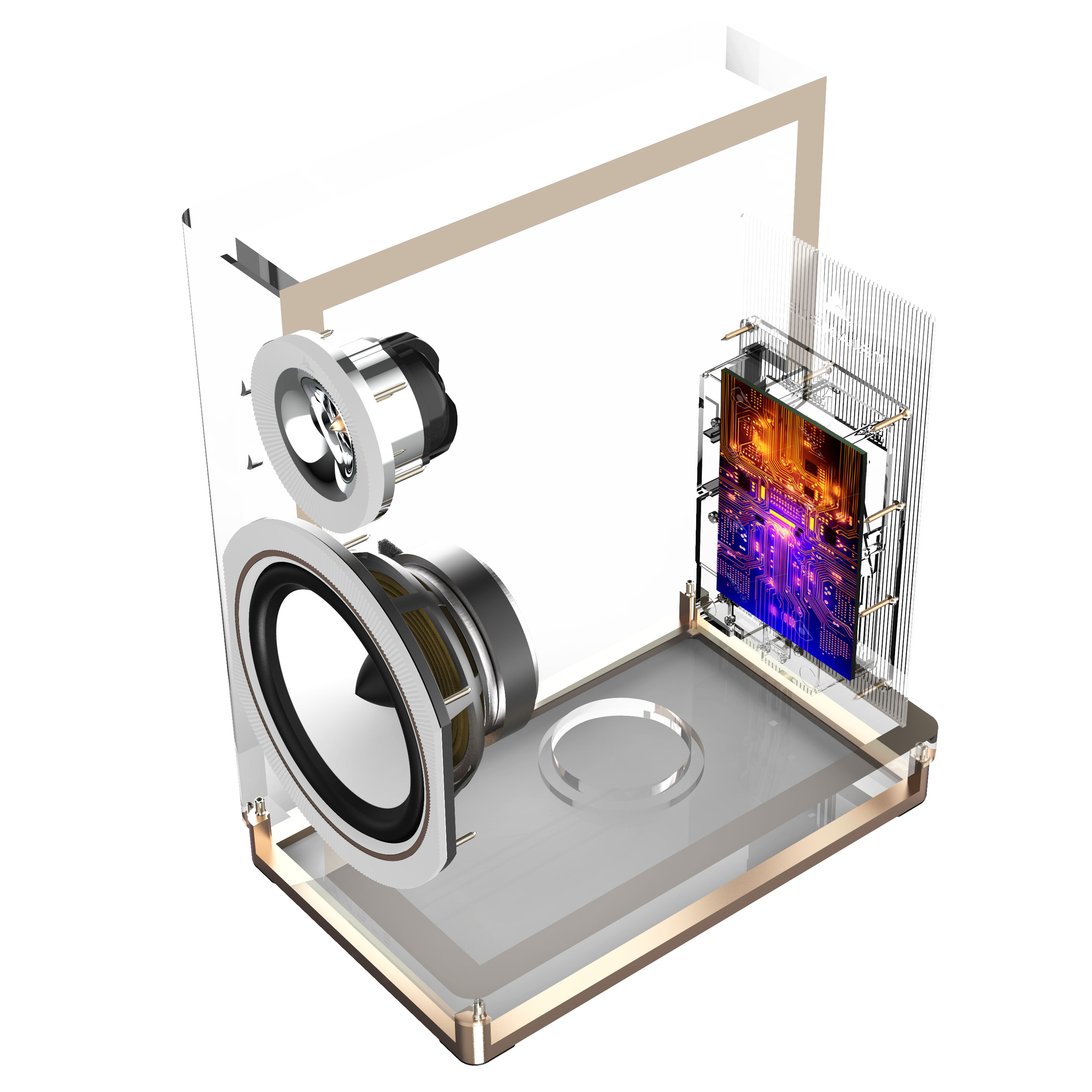 The curved shape of the cabinetry combined with the structured relief of the silicone rings ensures better diffraction of sound waves.